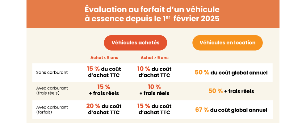 L’évaluation peut se faire sur la base des dépenses réellement engagées, autrement dit, au réel, ou sur une base forfaitaire. Elle diffère en fonction du type de véhicule : essence, hybride ou électrique. Le choix s’effectue au cas par cas, et s’il le souhaite, l’employeur peut revoir cette option pour l’année écoulée. L’évaluation au réel se fait sur la base d’un pourcentage du prix d’achat ou du coût annuel de location auquel s’ajoutent les frais d’entretien, d’assurance et, le cas échéant, les frais de carburant pris en charge par l’employeur pour l’usage privé. Pour les véhicules mis à disposition à compter du 1er février 2025, les taux pour l’évaluation au forfait des véhicules à essence ont été relevés de manière significative.